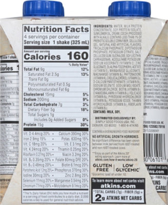 The 11 Best Label Atkins Vanilla Shake Nutritions (2022 reviews) The Atkins delicious gluten free shake makes good tasting, is great with low sugar and it is used for low fat. The manufacturer says: With 23 grams of protein and 7 grams of fiber per serving, our shakes are formulated to keep you satisfied and energized for the busy day ahead. Calories in Atkins Shake - Calorie, Fat, Carb, Fiber, & Protein Info Calories In Mock Atkins Shake Calories: 170, Fat: 7g, Carbs: 11g, Protein: 14g, Fiber: 5g Calories In Roos Atkins Shake and Pudding Protein Pudding 1/2 cup serving Calories: 72, Fat: 3g, Carbs: 6g, Protein: 5g, Fiber: 1g Calories In Breakfast Egg Nog (low carb) w/Atkins Shake Calories: 275, Fat: 17g, Carbs: 3g, Protein: 23g, Fiber: 1g Atkins Protein Shake, 4pk Ingredients - CVS Pharmacy Find the full list of Atkins Protein Shake, 4pk ingredients at CVS. Learn the key ingredients in your favorite products and enjoy fast, free shipping on most orders! ... Diet & Nutrition > Weight Loss > Atkins Protein Shake, 4pk. Atkins Protein Shake, 4pk Ingredients. 4.5 (116) Choose options. More Product Details. Ships Free With. CarePass TM ...