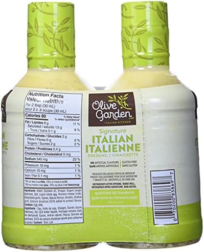 Olive Garden Signature Italian Dressing, 16 fl oz - Smith’s ... Shop for Olive Garden Signature Italian Dressing (16 fl oz) at Smith's Food and Drug. Find quality condiment & sauces products to add to your Shopping List or order online for Delivery or Pickup. ... Nutritional Information. OptUP® Nutrition Rating. Learn More. Nutrition Facts. servings per container. Serving size 2tbsp (31 g) Amount per ...